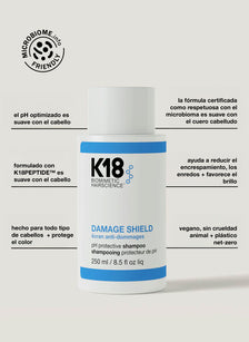 DAMAGE SHIELD pH protective shampoo Champú protector seguro para el color que mantiene la salud y fortaleza del cabello.